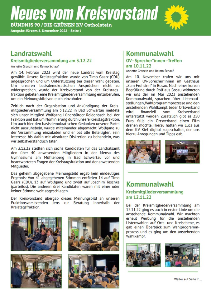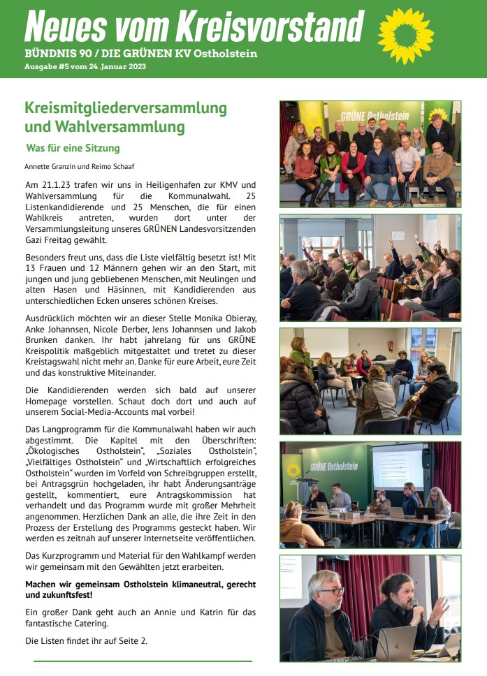 In Zukunft werden 10 Kreistagsabgeordnete und 12 bürgerliche Mitglieder in Ostholstein für grüne Themen kämpfen. Ebenfalls konnten wir mit unseren Ortsverbänden wieder Mandate erringen, damit auch vor Ort in den Gemeinden progressive Ideen und Konzepte auf der Tagesordnung stehen werden. Der Anspruch unseren Kreis voranzubringen, wird unsere politische Arbeit bestimmen. Wir freuen uns daher über diese Verantwortung, wissen sie zu schätzen und werden unsere Aufgaben dementsprechend angehen.