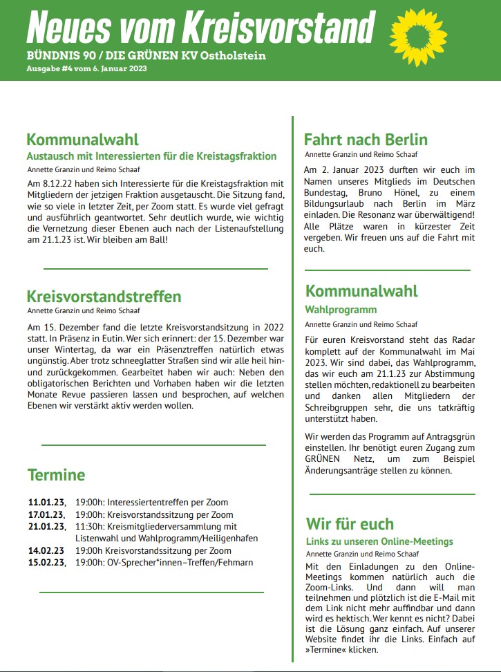 Annette Granzin war am vergangenen Samstag in Oldenburg und Heiligenhafen präsent, während sie diesen Samstag Timmendorfer Strand, den Ortsverband Scharbeutz in Haffkrug sowie Eutin besuchte. Bina Braun hingegen bereiste in dieser Woche Stockelsdorf, Bad Schwartau, Eutin, Haffkrug und Heiligenhafen. In Eutin und Haffkrug traten beide Politikerinnen gemeinsam auf.