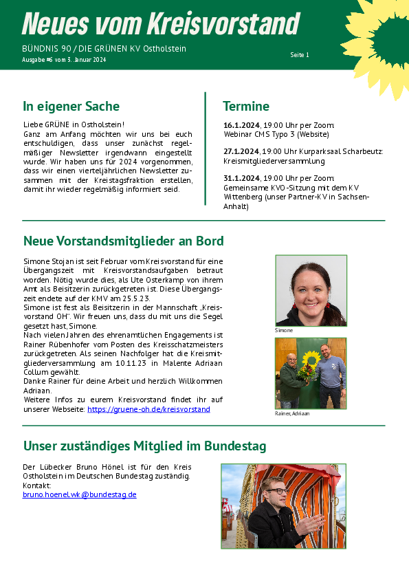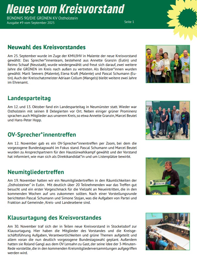 Somit sind die GRÜNEN im Kreis Ostholstein bereit, sich den anstehenden Herausforderungen zu stellen und sich allmählich auf die Bundestagswahl vorzubereiten. Zahlreiche Neueintritte in die Partei geben weiteren Schwung, sich für GRÜNE Belange stark zu machen.
