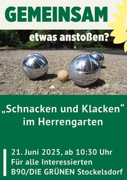 Bei schönem Wetter und einem entspannten Boule-Spiel ins Gespräch kommen. Das ist unser Plan für den 21. Juni 2025, ab 10:30 Uhr für alle Interessierten im Herrengartenpark. Kommt gerne dazu und lasst uns herausfinden, wie wir gemeinsam etwas anstoßen können.