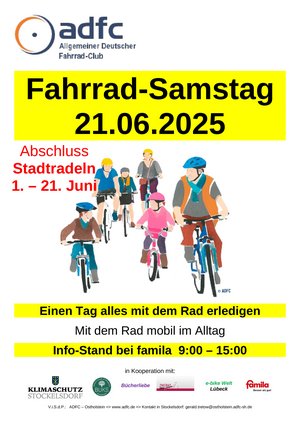 Der Allgemeine Deutsche Fahrrad-Club (ADFC) veranstaltet als Abschluss des „Stadtradeln“ am Samstag, den 21.06.2025 von 9:00 – 15:00 einen Infostand auf dem Parkplatz des Warenhauses „famila“. Beteiligt sind die Kooperationspartner Klimaschutz - Stockelsdorf, Beirat für Umwelt- und Klimaschutz, Buchhandlung „Bücherliebe“, Fahrrad Gehrmann, e-bike – Welt Lübeck und famila mit vielseitigen Informationen zur Radverkehrsförderung in Stockelsdorf, zu Radtouren, zur Verkehrssicherheit sowie zu Fragen und Wünsche der Fahrradfahrenden.