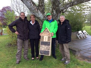 Ebenso begeistert zeigte sich Lehrerin Kerstin Rothenberger von der Erich-Kästner-Schule mit ihrer NaturAG, als sie das zweite ziemlich große Hotel erhielten. Die Kinder zeigten voller Eifer nicht nur ihren Garten samt Hochbeet, sondern suchten auch gleich mit dem hilfreichen Hausmeister Herrn Leitner einen Platz an der Schulwand aus.