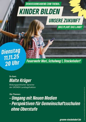Am Dienstag 11.11.2025 um 20:00 steht die Bildung von Kindern und deren Zukunft in Stockelsdorf im Fokus. Der Ortsverband Bündnis90/DIE GRÜNEN lädt ein zu Vortrag und Diskussion zur Bildungspolitik in Schleswig-Holstein. Veranstaltungsort sind die Räumlichkeiten der Feuerwehr Mori, Schulstraße 1 in Stockelsdorf.
