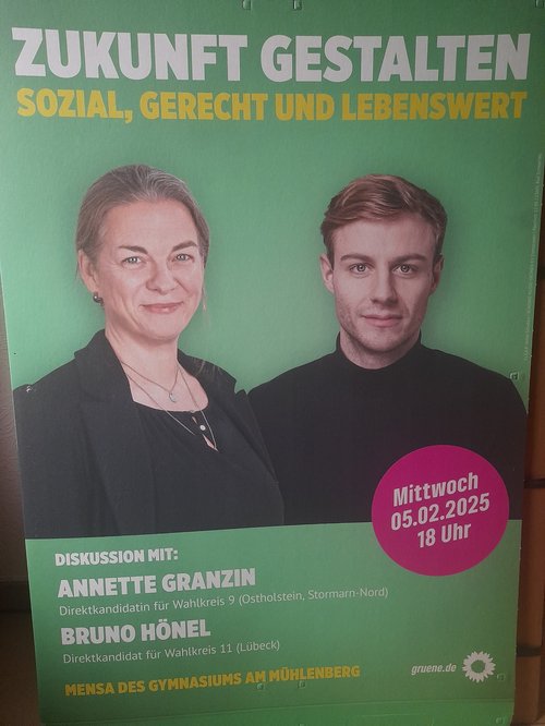 Wie bereits in den Medien und auf Plakaten angekündigt, lud unser GRÜNER Ortsverband am 05.02.2025 gemeinsam mit dem Ortsverband Stockelsdorf zu einer Veranstaltung mit dem Titel " Zukunft gestalten- Sozial, gerecht und lebenswert " ein. Als Gäste begrüßten die Veranstalter*innen unsere Direktkandidatin Annette Granzin sowie den Lübecker Bundestagsabgeordneten Bruno Hönel. Rund 50 interessierte Bürger*innen folgten der Einladung und beteiligten sich an einer lebhaften Diskussion.