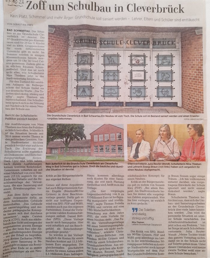 Die Schulleiterin der Grundschule Cleverbrück, Frau Thielsen, hat eindrücklich geschildert, warum ein Neubau zwingend nötig ist: die pädagogischen Anforderungen brauchen größere Klassenzimmer, dazu Gruppenräume für Differenzierungsunterricht in der inklusiven Schule und natürlich Platz für die Ganztagsbetreuung. Für Kinder und Lehrkräfte ist das alte Gebäude mit feuchten schimmeligen Räumen, stinkenden Toiletten im Keller nicht mehr zumutbar – so findet die Schule auch keine neuen Lehrkräfte, die sowieso jetzt schon fehlen.
