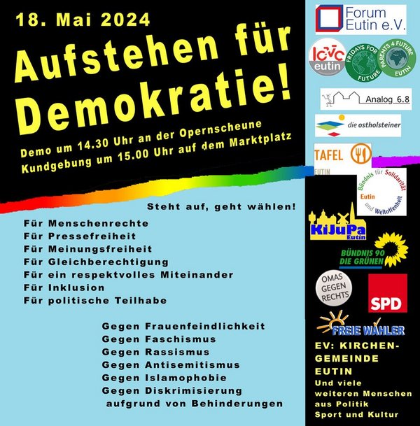 Wir unterstützen die Demonstration „Aufstehen für Demokratie“ am 18. Mai in Eutin.