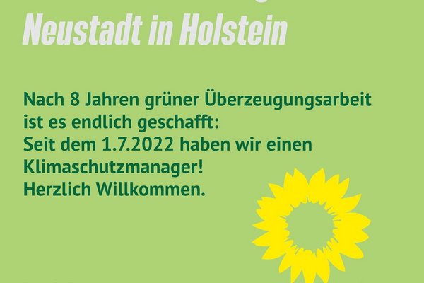 16.07.22 - Nach acht Jahren konsequenter grüner Überzeugungsarbeit ist es geschafft: Seit dem 1. Juli 2022 gibt es in Neustadt in Holstein einen Klimaschutzmanager! Dieses neue Amt ist ein wichtiger Schritt, um den Klimaschutz in unserer Stadt systematisch voranzubringen. Der…