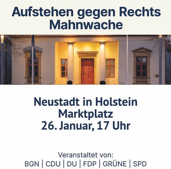 Am 26. Januar um 17:00 Uhr findet auf dem Marktplatz in Neustadt in Holstein eine Mahnwache gegen Rechtsextremismus, Hass und Hetze statt.
