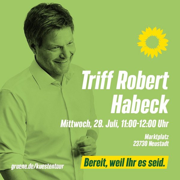 Am 28. Juli um 11:00 Uhr kommt Robert Habeck nach Neustadt in Holstein und bringt unseren Bundestagskandidaten für Ostholstein, Jakob Brunken, mit.