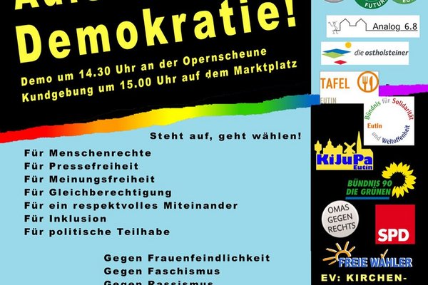 16.05.24 - Wir unterstützen die Demonstration „Aufstehen für Demokratie“ am 18. Mai in Eutin. Der Auftakt findet um 14:30 Uhr an der Opernscheune statt, die anschließende Kundgebung beginnt um 15:00 Uhr auf dem Marktplatz in Eutin. Gemeinsam setzen wir ein Zeichen für Demokratie,…
