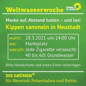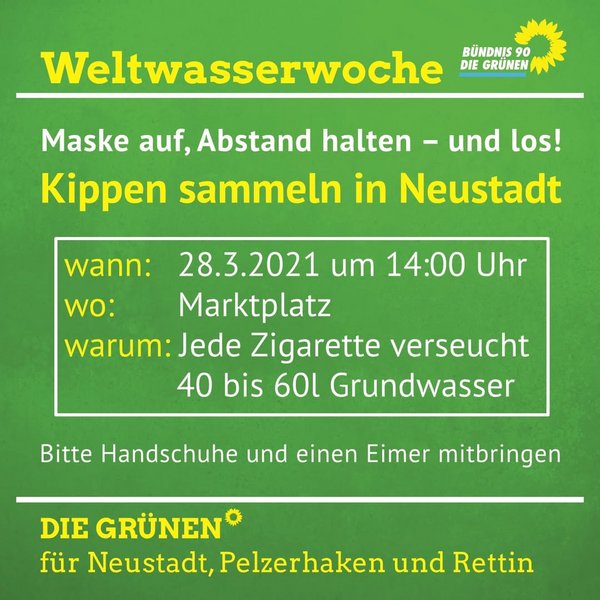 Zum Weltwassertag am 28. März 2021 laden wir dazu ein, gemeinsam in der Neustädter Innenstadt Zigarettenkippen zu sammeln. Jede Zigarette verschmutzt 40 bis 60 Liter Grundwasser – ein Thema, das uns als GRÜNE besonders am Herzen liegt.