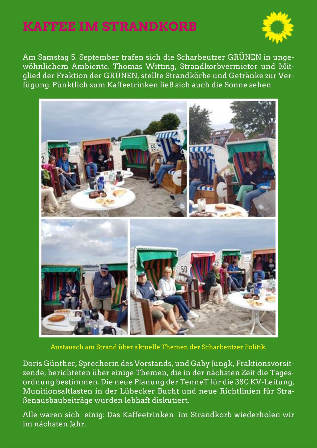 Die Fraktionsvorsitzende Gabi Jungk begrüßte die Gäste, insbesondere Bürgermeisterin Bettina Schäfer und die Bürgervorsteherin Anja Bendfeldt, sowie Gäste aus den Dorfvorständen und den anderen Parteien. Wolfgang Kummerfeldt stellte sich als neuer Sprecher der Grünen vor.