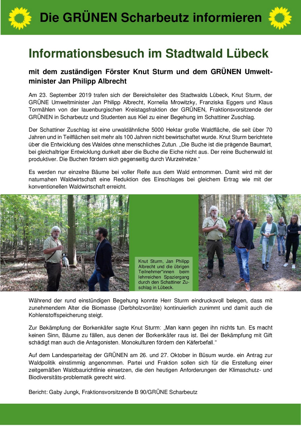 Da zu befürchten ist, dass diese Fällungen nicht mehr einer ordnungsgemäßen Forstwirtschaft entsprechen, hat auf Initiative der Fraktion von BÜNDNIS 90/DIE GRÜNEN in der Gemeinde Scharbeutz ein interfraktioneller Arbeitskreis ein Schreiben an den Ministerpräsidenten, den Umweltminister, den Direktor der Landesforsten und die Vorsitzende des Verwaltungsrates der Landesforsten formuliert. In diesem Schreiben wird Ministerpräsident Daniel Günther aufgefordert, sich für die Erstellung einer zeitgemäßen Waldbaurichtlinie in Schleswig-Holstein einzusetzen, die den heutigen Anforderungen an den Klimaschutz gerecht wird und den Erhalt der Biodiversität in den Vordergrund stellt.